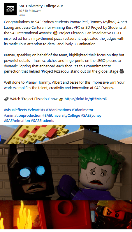 Whilst I did feel our project came out very nicely, when entering it in the SAE Awards, we did not expect to win anything, let alone first place. We ended up being the very first from Sydney Campus to ever win. Not only that, but most winners submitted a project from their major work where your group is given their final two trimesters to do everything they can. We, however, won with just one trimester in our first year of study. Needless to say, I was pretty proud of me and my team.